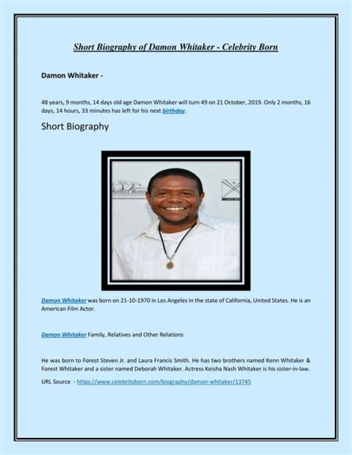Damon Whitaker (born 21 October 1970) is an American actor. Forest Whitaker and Kenn Whitaker, also actors, are his elder brothers. He is often cast as the younger version of Forest’s characters due to his resemblance to Forest.