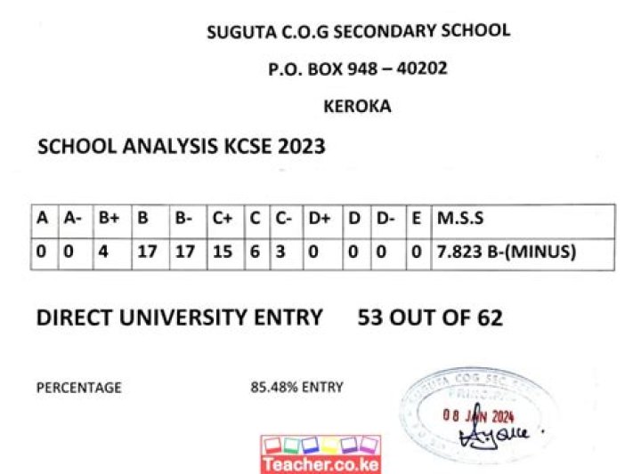 Individual candidates can check their KCSE results by SMS or online using an SMS number or website link provided at the release of the exam. Candidates and parents should visit the school for their official results slip. Results for all candidates and the school national, county and local ranking can also be found from the schools’ office.