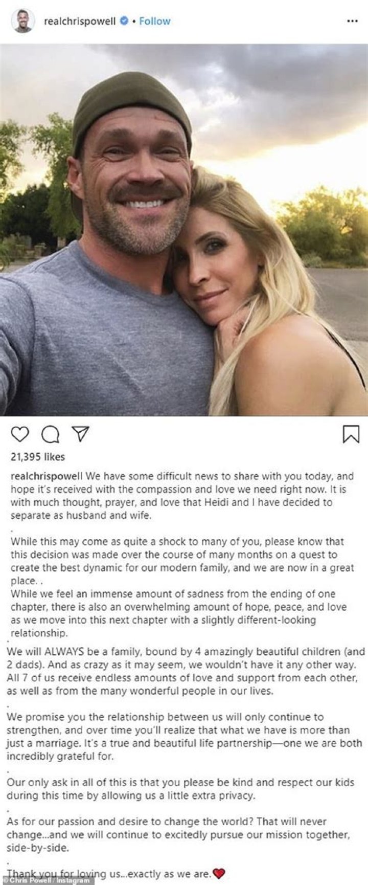 “We have a troublesome news to impart to you today and trust it’s gotten with the sympathy and love we want at the present time. It is with much thought, petition, and love that Heidi and I have chosen to separate as a couple.”