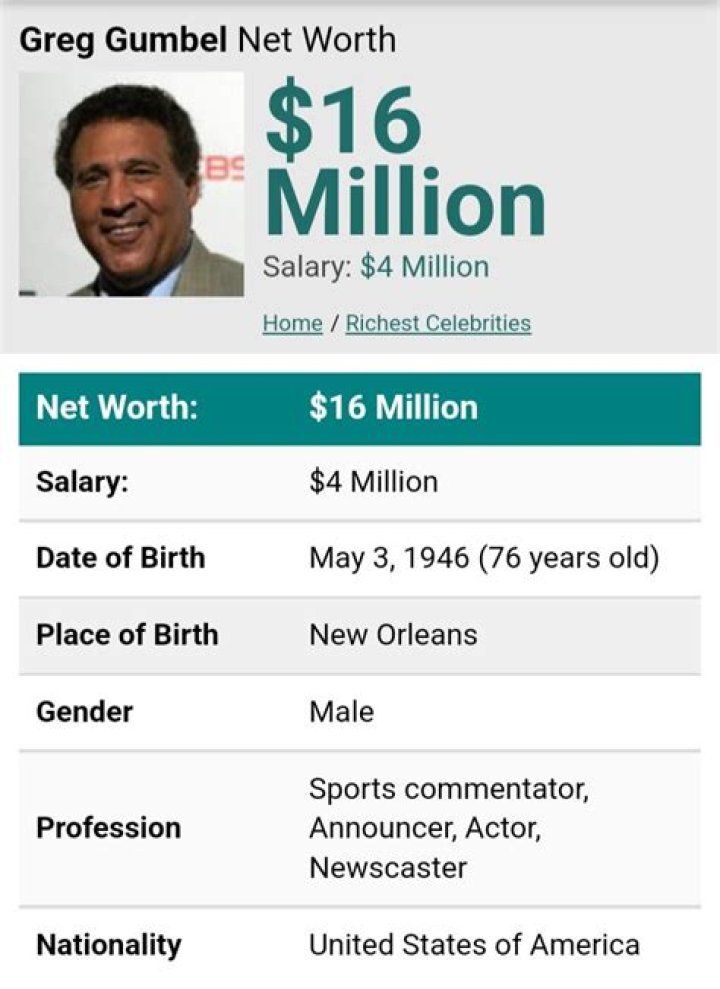 Have you ever wondered how rich Greg Gumbel is, as of mid- 2016? According to authoritative sources, it has been estimated that Greg Gumbel’s net worth is as high as $16 million, an amount earned through his successful career as a sportscaster. In addition to being one of the best-known faces on CBS, Gumbel has also worked for NBC, which improved his wealth. His annual salary is reputedly $4 million.